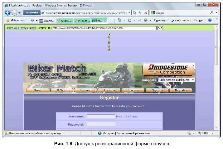 Самый простой вариант обойти ограничение на посещение конкретного узла — воспользоваться CGI-прокси или «анонимайзером». В отличие от http-прокси, ничего в настройках браузера изменять не нужно, требуется лишь перейти на веб-сайт «анонимайзера», содержащий поле ввода адреса и кнопку перехода на введенный адрес. Для примера я расскажу, как открыть доступ к форме регистрации на веб-сайте www.bikermatch.co.uk, регистрироваться на котором могут только обладатели IP-адресов Великобритании, т. е. предположительно жители туманного Альбиона. Запускаю браузер Internet Explorer и пытаюсь получить доступ к веб-сайту www.bikermatch.co.uk. Загрузка происходит нормально. Перехожу в раздел Full search (Полный поиск) — открывается страница с сообщением, что требуется регистрация, совершенно бесплатная. Щелкаю мышью на ссылке Join Free (Присоединиться бесплатно)… Упс, я и не догадывался, что живу в России (смайл) (рис. 1.5).