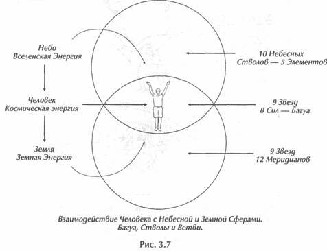 В этих трех сферах содержатся основные принципы, применяемые в китайской философии и астрологии. Десять Небесных Стволов базируются на аспекте Инь и Ян Пяти Элементов (соответствуют Инь/Ян системам чувств/органов). Книга Перемен и ее внутренние принципы Багуа, или Восьми Сил, согласуются с восемью необычайными меридианами в теле. Эта пренатальная меридиональная система формируется восемью планетами (в центре Солнце и Луна) и восемью соответствующими звездными сущностями. Принципы Багуа также заложены в астрологии девяти звезд (восемь сил + центральная сила Тайцзи = 9). Заложены эти принципы и в даосской астрологии. Энергия Северной Звезды и Большой Медведицы играет особую роль во всей даосской практике. Даосские мастера заметили, что в Центральном Дворце звезд девять энергетических точек точно отражают изменения энергетического состояния Вселенной и нашей планеты. Эти девять точек представляют собой семь звезд Большой Медведицы, звезду света, или звезду силы Ян (Полярную), и звезду темноты, или звезду силы Инь (Бегу). Двенадцать Земных Ветвей взаимодействуют с Земными Силами и с двенадцатью главными акупунктурными каналами. Небесные Стволы обладают энергией высокой частоты, согласованной с Вселенской энергией. Земные Ветви имеют низкую частоту, согласованную с энергией Земли и ее окружения. Принципы Пяти Элементов, Багуа и, в меньшей степени, соответствующих Стволов и Ветвей, являются фундаментальными для планетарных и звездных медитаций. Через несколько страниц мы более глубоко рассмотрим эту тему (принципы дуализма и триединства уже описывались выше).