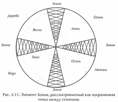 Чаще всего применяется система использования Пяти Элементов в соответствии с временами года. В этой системе Земной Элемент (бабье лето) следует за Элементом Огня (лето) (см. рис. 3.10). Менее популярным является метод, в котором Земле приписывается центральное положение и короткий земной период размещается между каждой парой сезонов (см. рис. 3.11).