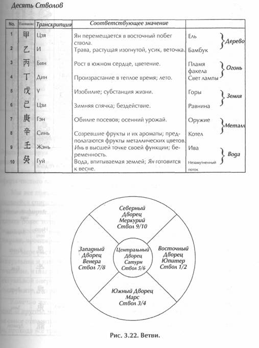 Как описывалось выше, десять Небесных Стволов представляют собой иньский и янский полюсы каждого из Пяти Элементов, в то время как двенадцать Земных Ветвей связаны с двенадцатью секторами поля вращения Земли, спроецированного в мир звезд.