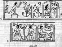 15. В Туринском папирусе, опубликованном Лепсиусом, пахота, сев, жатва и молотьба представлены на одном изображении, а покойный стоит в позе адорации перед "Хапи, отцом богов". В папирусе Небсени покойный поклоняется Эннеаде богов, обитающих в Полях Покоя, произнося при этом: