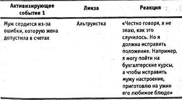 Возьмем то же событие, но в качестве линзы послужит другая схема. Теперь схема называется Альтруистка: "Для меня главное - заботиться о других, пусть даже в ущерб себе. Мне проще принять чужую точку зрения, чем отстаивать свою. Когда другой человек чем-то недоволен, я считаю, что именно я должна исправить дело".