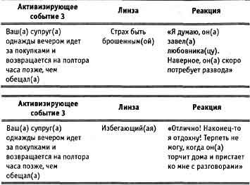 Одно и то же событие ведет к совершенно разным реакциям в зависимости от того, какая схема действует. Реакции разнятся так сильно, как если бы люди реагировали на разные события. Как вы видели, каждая схема диктует свою интерпретацию, а мы обычно даже не ставим свою интерпретацию под вопрос, потому что не знаем о присутствии схемы. Вас когда-нибудь удивляло, что другой человек неправильно понял ваши слова? Вас озадачила его реакция? В следующий раз. когда это случится, спросите себя, через какую линзу этот человек по-, смотрел на вас. Чем чаще вы будете это делать, тем яснее увидите, как схемы меняют восприятие ситуации.