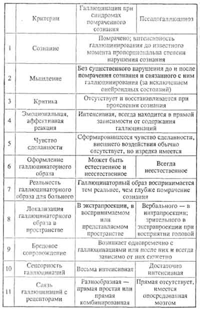 Итак, сенсориализованные представления по одному из признаков (степени яркости, чувственности) напоминают галлюцинаторные переживания, принципиально отличаясь от них по степени произвольности, отсутствию насильственности, характеру проекции, отношению к ним больных и другим признакам.
