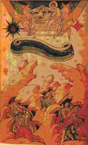Рисунок из рукописи Апокалипсиса, датируемой XVI веком. Подчеркнуто, что действие происходит НА ЗВЕЗДНОМ НЕБЕ. Взято из [212], т. 8, с. 446.