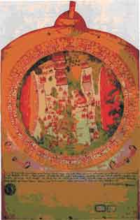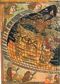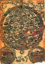 Старинная карта мира Джованни Леардо, якобы 1442 года. Giovanni Leardo, Мара Mondi Figura Mondi. Считается самой ранней из сохранившихся карт венецианской космографии. Карта ориентирована не так, как современные. Восток помещен наверху, запад - внизу, север - слева, юг - справа. Однако, скорее всего, эта карта создана не ранее XVI-XVII веков. Иерусалим на ней уже показан в современной Палестине, хотя храм Соломона изображен еще в виде старого ордынского атаманского храма-мечети. Сегодня такую форму сохранили западноевропейские готические соборы. Подробности см. в ХРОНб и ХРОН7. Взято из [321], с. 37, карта 2.7.
