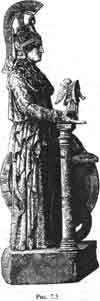 Более того, историки далее сообщают: "Предание образу Богоматери придает наименование "Атенайи" (Афины - Авт.); позднее это же название придается образу "Панагии Атениотиссе", который в средние века был высоко чтим в Парфенонском храме". (См. рис. 7.4.) Итак, кроме тождества "античная" Афина = христианская Богоматерь, мы обнаруживаем, что, скорее всего, знаменитый "античный" Парфенон был построен в средние века как христианский храм, посвященный христианской Богоматери = Афине. Как мы начинаем теперь понимать, Афина- это было просто одно из имен Марии Богородицы. Классическое "античное" изображение Афины Партенос, то есть Афины Парфенонской см. на рис. 7.5.
