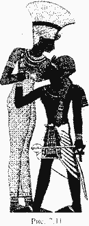 Историки отмечают: "В своих главных чертах она (то есть евангелическая сцена благовещения Марии и непорочного зачатия - Авт.) больше всего совпадает с соответствующими сценами из жизни мифических спасителей древности: еврейского... Самсона, вавилоно-фи-никийского... Таммуза-Адониса и индийского... Будды".Или вот "египетское помазание- крещение фараона царями Го-ром... и Тотом... Они льют на царя священную воду, изображаемую здесь струями крестов... Крест же в руках самого царя". Аналогичное "древне"-египетское изображение мы приводим на рис. 7.29.