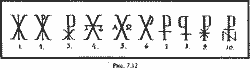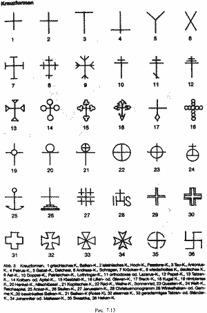 На рис. 7.13 приведена очень интересная таблица, показывающая различные формы средневековых христианских крестов. "Древне"-египетский крест с ушком или с петлей присутствует тут под номером 20. Обратим также внимание на Т-образный крест (номер 3) и на вилообразный крест (номер 5). В дальнейшем мы неоднократно столкнемся с этими, по-видимому, весьма старыми формами христианского креста. Отметим также крест под номером 25, представляющий собой фактически османский полумесяц со звездой-крестом.
