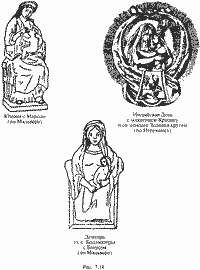 На рис. 7.18 показаны якобы "античные" изображения различных "древних" богинь с младенцем. Это "древне"-римская Юнона с Марсом (по Мальверу), индийская Дева с младенцем Кришну (по Иере-миасу), Деметра с Бахусом, то есть просто Д-Матерь, или Део-Матерь, или Богоматерь (по Мальверу). Далее, "античная" Диана, на голове которой крест, а рядом с ней - османский полумесяц со звездой. Затем "древне"-египетская богиня Гатор, или Хатор, с младенцем Озирисом (по Иеремиасу). Наконец, так называемая Салисбюрийская Богородица (по М. Брока).