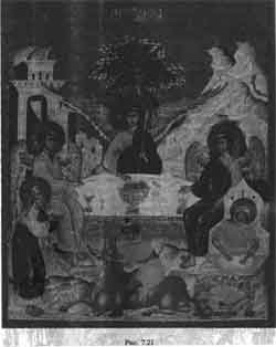 Мы же скажем так: не Иисус Христос похож на "древнего" Митру, а бог Митра является одной из форм поклонения Иисусу Христу после XI века н. э. Напомним, что скалигеровская история считает Митру восточным "древне"-арийским богом, впоследствии "древне" - персидским божеством, культ которого распространился по всей Малой Азии. Одно из изображений "очень древнего" Митры см. на рис. 7.20. Здесь Митра показан убивающим быка. Вероятно, именно к этому религиозному мотиву восходит известная коррида, до сих пор сохранившаяся в Испании. Но этот митраистический сюжет явно является христианским. Его изображали на православных иконах. На рис. 7.21 приведена икона православной Троицы. На переднем плане мы видим буквально ту же сцену, что и на "античных" барельефах, представляющих Митру убивающим быка.