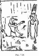 Н. В. Румянцев писал: "На первой картине божественный вестник Тот стоит перед царицей-девой Мет-ем-ве (Марией? - Авт.) и благовествует, что она родит сына (см. рис. 7.26 - Авт.).