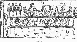 На четвертой картине представлена самая сцена рождения царственного богочеловека, и, наконец, пятая рисует нам поклонение младенцу (как и положено по Евангелиям, см. рис. 7.28 - Авт.). Три коленопреклоненные человеческие фигуры (то есть три евангельских волхва - Авт.) приветствуют и подносят ему (младенцу Христу? - Авт.) дары, а рядом с ними то же самое совершают и боги... Полагаем, что всякие дальнейшие объяснения к этим пяти картинам излишни", - заканчивает Н. В. Румянцев.