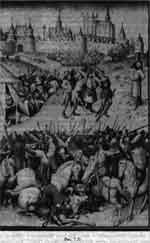 На рис. 7.31 мы приводим старинную миниатюру из "Большой Французской хроники", называемую "Как короли Хильдеберт и Хло-тарь [Лотарь] осадили город Сарагосу и как римский князь Бели-зар [Belisar] (Велизарий - Авт.) был убит франками и забросан камнями". Изображена казнь Велизария (Великого Царя?). Его привязали к столбу и забросали камнями (рис. 7.32).