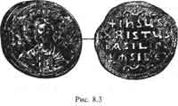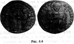 18b. ИИСУС ХРИСТОС. Зато, оказывается, есть средневековые монеты с изображением Иисуса Христа и с соответствующей надписью. На рис. 8.3 приведена одна из таких монет. Иисус Христос изображен в нимбе, на обороте монеты написано "Иисус Христос Бази-левс", то есть "Царь". Считается, что монета была отчеканена при Иване Цимисхии. На рис. 8.4 мы приводим еще одну из таких монет. Как отмечает В. М. Потин, изображения Иисуса Христа "характерны для средневековых монет". В данном случае на одной стороне золотой монеты мы видим Иисуса Христа (внизу), а на обороте - двух средневековых правителей (вверху). Считается, что это Лев VI и Константин VII. По-видимому, они выбиты на монете как "наместники Христа". Которым тот вручил власть.