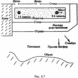 Анализируя описание средневекового путешествия Даниила на Голгофу, мы отметили, что Даниил говорит об этом месте не как о реальной могиле Иисуса, а как о "месте действия". Он так vi называет его: "место распятия". Таким образом, на константинопольской горе Бейкос сегодня, по-видимому, чудом сохранился - возможно, в перестроенном виде - памятник, рассказывающий о распятии именно на этом месте Иисуса Христа. Этим обстоятельством, вероятно, объясняется и непомерно большой размер "могилы", явно не соответствующий размеру реальной могилы. Теперь все становится на свои места. Обнесли решеткой не могилу Иисуса, а то святое место, где был распят Иисус, то есть "место действия". В таком случае размер участка земли в 17 метров на 2 метра вполне объясним.