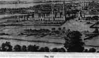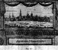 "Проезд Девичьего поля", ранее просто "ДЕВИЧЬЕ ПОЛЕ", затем - Новодевичья набережная, Новодевичий переулок. Девичий монастырь изображен и назван Девичеи монастырь на старинном плане Москвы примерно 1707 года, называющемся "Вид с Каменным мостом из Замоскворечья" (см. рис. 9.6 и 9.7). На рис. 9.8 мы приводим старую гравюру 1702 года с видом Новодевичьего монастыря и его окрестностей в начале XVIII века. Хорошо видно большое поле, остававшееся незастроенным до начала XVIII века.