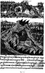 При описании Куликовской битвы в "Сказании о брани благо-вернаго князя Димитриа Ивановича с нечестивым царем Мамаем еллинским" сообщается, что ночью перед началом сражения воин Фома из войска Дмитрия Донского был поставлен на стражу на реке Чуре, на Михайлове. Ему было небесное видение, о чем он сообщил князю. Вот этот фрагмент: "В ту же нощь некто разбойник был именем Фома от великого князя на реци на Чюру на Михаилови мужества его ради, на крепком стражи стоя от поганых". На рис. 9.11 мы приводим старинное изображение этого сюжета из "Повести о Куликовской битве" (текст и миниатюры Лицевого Свода XVI века). Река Чура изображена на миниатюре слева внизу.