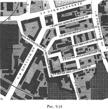 Протекает ли московская река Чура по территории с подобным названием? Да, протекает. Достаточно взглянуть на карту Москвы, приведенную на рис. 9.12, чтобы увидеть буквально рядом с рекой Чурой и Мусульманским кладбищем Михайловский проезд. Более того, он тут не один с таким названием. Здесь - целое скопление Михайловских проездов. Восемь проездов! На увеличенном фрагменте современной электронной карты Москвы (рис. 9.14) мы видим 1-й Верхний Михайловский проезд, 2-й Верхний Михайловский проезд и так далее, до 5-го Верхнего Михайловского проезда. Более того, их пересекает Михайловский поперечный проезд. Наконец, здесь же проходят еще 1-й и 2-й Нижние Михайловские проезды. На карте, которая была в нашем распоряжении, они не обозначены, но названы в справочнике "Улицы Москвы". Совершенно ясно, что вся эта территория тесно связана с названием Михайлов. Скорее всего, это название - старое. Может быть, тут была старая Михайловская слобода и что-то еще с таким именем. Надо сказать, что московская река Чура не длинная, поэтому она практически целиком расположена около этого "Михайловского места" Москвы (рис. 9.12). С полным правом стоянку войск в этом месте летописцы могли указать как стоянку "на Чуре, на Михайлове".
