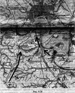 Таким образом, наша реконструкция движения войск Дмитрия Донского и Владимира Андреевича такова. Войска Дмитрия двигались примерно по Ордынской дороге на Котел, она же - Коломенская дорога, как отмечено на карте (рис. 9.20). А полки Владимира