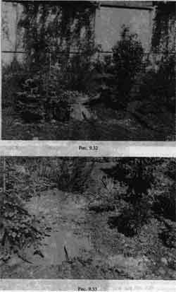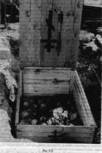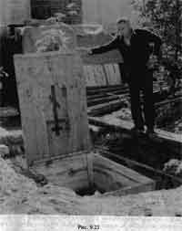 Так оно и оказалось! Не успели мы войти на площадку перед церковью, наше внимание привлек огромный дощатый ящик, уже опущенный в свежую могилу и приготовленный к погребению (рис. 9.21 и 9.22). На наших глазах рабочий начал засыпать могилу землей.
