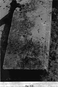 В-третьих, кроме черепов и костей в земле были найдены каменные надгробные доски, плиты одного и того же образца и размера, без каких-либо надписей (рис. 9.24). На всех этих досках изображен один и тот же узор. Он состоит из бляхи в центре, от которой отходят три полосы: прямая - вниз и две дуги, расходящиеся кверху.