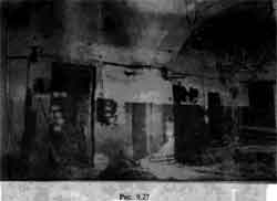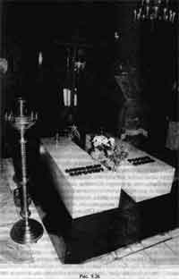Входим в церковь. Внутри ее, слева от входа - надгробие над могилами героев Пересвета и Осляби, сделанное всего лишь несколько лет назад (рис. 9.26). Как выглядело это место церкви в 1985 году, показывает старая фотография, помещенная сегодня на доске у входа в церковь (рис. 9.27). Здесь показано состояние храма сразу после того, как завод освободил его. Хорошо видно, что церковь была полностью разгромлена. Никаких следов могилы Пересвета и Осляби на фотографии 1985 года нет. По-видимому, древняя надгробная плита была к этому времени уже уничтожена или перенесена в другое место.