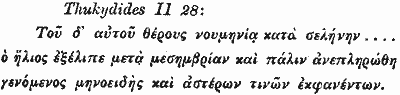 Во второй книге "Истории" солнечное затмение описано довольно подробно. Воспользуемся известным профессиональным переводом Фукидида, выполненным в XIX веке Ф. Г. Мищенко [р27]. Фукидид пишет: "В то же самое лето афиняне изгнали из Эгины эгинян с женами и детьми (речь идет о ПЕРВОМ годе войны. - А. Ф.)... В то же самое лето, в новолуние, - кажется только тогда это и возможно, - СОЛНЦЕ ЗАТМИЛОСЬ ПОСЛЕ ПОЛУДНЯ И ОПЯТЬ ВОСПОЛНИЛОСЬ, ПРИНЯВ ВИД ПОЛУМЕСЯЦА, И ПОЯВИЛОСЬ НЕСКОЛЬКО ЗВЕЗД" [р27], И: 27-28. Греческий текст приведен на рис. рr. 3.