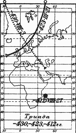 (расчет по вычислительной программе Turbo-Sky).В сложившейся тяжелой для скалигеровской хронологии ситуации Джонсон предложил другое затмение, происшедшее 30 марта 433 года до н. э., но оно не включается ни в какую триаду. Ближайшие триады: 447, 441, 430 годы до н. э. и 412, 405, 394 годы до н. э. Но они не подходят уже по другим соображениям. Да и фаза затмения, предложенного Джонсоном, оказалась всего лишь 7"8, то есть даже меньше, чем у неудачного затмения, указанного Петавиусом [р31], с. 177.