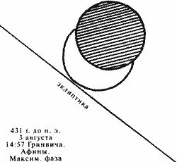 Мол, Фукидид сообщает о появлении звезд в то время, когда Солнце уже имело форму полумесяца. И поэтому сообщение о звездах может быть лишь словесным украшением. По нашей просьбе, филологический анализ греческого текста (рис. рг. 3) выполнила филолог Е. В. Алексеева (филологический факультет МГУ, 1976 год). Оказалось, что с лингвистической точки зрения Фукидид сообщает о следующих четырех последовательных событиях.
