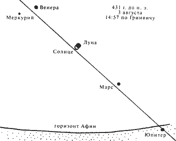 или планет не может быть и речи.Поскольку звезды при затмении 431 года до н. э. явно видны не были, то Хейс и Линн решили рассчитать расположение ярких планет в надежде, что хотя бы это может спасти положение. Однако оказалось, что Марс был всего в 3 градусах над горизонтом. Венера была высоко, примерно в 30 градусах над горизонтом. По поводу Венеры и Марса Гинцель осторожно выражается, что эти две планеты "возможно могли быть видны" [р31], с. 176. Однако при фактически ясном дне это маловероятно. Поэтому все надежды были возложены на Юпитер и Сатурн. Однако оказалось, что Юпитер в момент затмения вообще был ПОД ГОРИЗОНТОМ и потому не виден, а Сатурн хотя и был над горизонтом, но находился в Весах, на значительном удалении, на юге, и как пишет Гинцель, его "видимость была ЧРЕЗВЫЧАЙНО СОМНИТЕЛЬНА [sehr zweifelhaft]" [p31], с. 176.