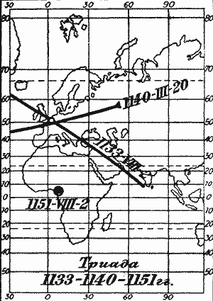 Учитывая все уже известные нам факты, следует заключить, что из двух получившихся решений, лучше всего отвечает исторической действительности, по-видимому, морозовская, более поздняя триада затмений середины XII века. А именно: 2 августа 1133 года н.э., 20 марта 1140 года н.э. и 28 августа 1151 года н.э. Решение XI века является, скорее всего, слишком ранним. На рис. рг. 9 показано решение 1133, 1140 и 1151 годов н.э., найденное Н.А.Морозовым. Изображены траектории лунной тени на земной поверхности для полных солнечных затмений 1133 и 1140 годов н. э., а также точка зенитной видимости лунного затмения 1151 года н. э.
