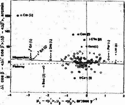 В целом, новый метод датировки Альмагеста по собственным движением, предложенный в [р23], мало отличается от первоначального варианта этого метода из [р21], [р22]. Разница лишь в том, что раньше Ю. Н. Ефремов получал датировки по каждой быстрой звезде в отдельности (при некотором выборе ее окружения). Поясним, что в методе Ю. Н. Ефремова положение быстрой звезды определяется по отношению к ее окружению, состоящему из близких к ней звезд. Нами было обнаружено, что изменение в составе окружения способно очень сильно изменить получаемую таким методом датировку [рб], с. 99-102; [р7], с. 200-212. Теперь же, в работе [р23] Ю. Н. Ефремов предлагает получать единую дату по всем быстрым звездам. При этом используется некоторое, не совсем понятное из текста [р23], правило выбора окружений. Эту единую дату Ю. Н. Ефремов и А. К. Дамбис определяют следующим образом [р23], с. 125.