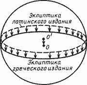 Однако приведенное возражение опровергается тем, что в фече-ском издании 1538 года все широты систематически увеличены, улучшены по сравнению с широтами латинского издания 1537 года на 25 минут, или же исправлены на более точные. Это не поправка на прецессию, так как широты не прецессируют. Поправка является круговой, то есть вся эклиптика целиком передвинута к югу, почти на диаметр Солнца.При этом эклиптика феческого издания заняла естественное, астрономическое положение, поскольку ее плоскость прошла практически через центр системы координат (рис. 2.5). В предыдущем, латинском же издании эклиптика была еще "плохой" в том смысле, что ее плоскость не проходила через центр небесной сферы. Таким образом, эклиптика латинского издания была измерена плохо, а эклиптика последующего феческого издания была существенно улучшена. Очевидно, что мы имеем здесь дело с улучшением первичного латинского текста.