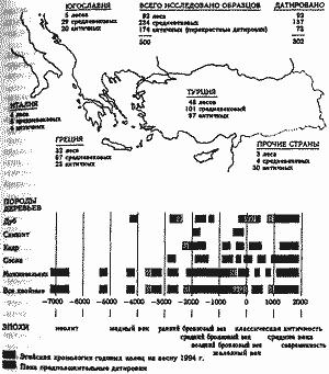 Приведем диаграмму дендрохронологических датировочных шкал для указанных стран, показывающую состояние этого вопроса весной 1994 года. Эта диаграмма была любезно предоставлена в наше распоряжение профессором Ю. М. Кабановым (Москва). В 1994 году он участвовал в конференции, на которой американский профессор П. Кунихольм (Peter Ian Kuniholm) делал доклад о современном состоянии дендрохронологии и, в частности, демонстрировал эту диаграмму.
