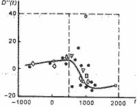 В теории движения Луны известен параметр D" - так называемая вторая производная лунной элонгации, характеризующая ускорение. Проблема вычисления D" на большом временном интервале как функции времени обсуждалась в дискуссии, организованной в 1972 году Лондонским Королевским обществом и Британской Академией наук. Зависимость D" от времени была вычислена известным американским астрономом Р. Ньютоном. Эта кривая показана на рис. 4.1.Р. Ньютон писал: "Наиболее поразительным событием... является стремительное падение D" от 700 года (н. э. - Авт.) приблизительно до 1300 года... Это падение означает, что существует "квадратичная волна" в оскулирующем значении D"... Такие изменения в поведении D" - и на такие величины - невозможно объяснить на основании современных геофизических теорий". Специальная работа Р. Ньютона "Астрономические доказательства, касающиеся негравитационных сил в системе Земля-Луна" также посвящена попыткам объяснения этого разрыва, скачка на порядок в поведении D".