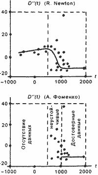 Разброс значений D", незначительный на интервале 900-1900 годы н. э., возрастает при движении влево от 900 года до 400 года н. э. Это указывает на нечеткость и недостаточность наблюдательной информации, содержащейся в летописях, отнесенных сегодня хронологами к этому периоду. Затем, левее 400 года н. э., наступает зона отсутствия наблюдательных данных. От этой эпохи до нас не дошло никаких сведений. Это отражает естественную картину распределения наблюдательных данных во времени. Первоначальная точность средневековых наблюдений была, конечно, невысока. Затем она нарастала по мере улучшения и совершенствования техники наблюдений, что и отразилось в постепенном уменьшении разброса D".