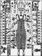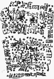 В 1857 году египтолог Г. Бругш обнаружил древнеегипетский саркофаг. На его внутренней крышке было подробно изображено звездное небо с гороскопом. (См. рис. 4.3.) Весь ритуал захоронения, древнее демотическое письмо и т. п. указывали, по мнению археологов, воспитанных на скалигеровской хронологии, на эпоху I века н. э. Тем не менее неоднократные попытки астрономов датировать гороскоп началом н. э. к успеху не привели. Первая более или менее аккуратная, хотя и частичная, расшифровка зодиака Бругша и его датирование были выполнены Н. А. Морозовым. Его результат: 1682 год н. э. То есть семнадцатый век!