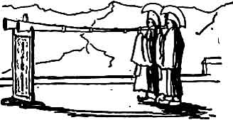 Все монахи сидели в позе лотоса, и каждый напоминал живую статую Будды. Две квадратные подушки, положенные одна на другую, служили нам сиденьем и возносили нас над полом сантиметров на тридцать. Мы сидели двойными рядами, каждые два ряда лицом к лицу. Сначала шла обычная служба. Руководитель хора, избранный за свои музыкальные познания и низкий голос, запел первый стих. Зычный голос его, постепенно затухая, оборвался, когда закончился воздух в легких. Мы подхватили припев, сопровождавшийся то боем барабанов, то мягким перезвоном колокольчиков. Мы очень старательно следили за своей дикцией, зная, что по музыкальной чистоте и точности судят о дисциплине в монастыре. Европейцу трудно было бы разобраться в нашей музыкальной грамоте. Вместо нот мы пользуемся дугами. Мы записываем подъемы и падения голоса. Основная мелодия представлена, таким образом, главной кривой. Для разного рода вариаций применяют запись малыми дугами наряду с главной.