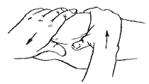 Большим пальцем с отягощением массажист воздействует на каждую точку, одновременно производя слабое потягивание к запястью. Воздействие – 3 сек.