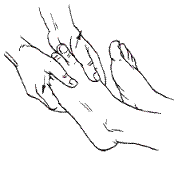 Массажист нажимает большим и указательным пальцами на точки, придерживая кисть больного своей свободной рукой. Начинают с точки у основания большого пальца, заканчивают конечной точкой мизинца.