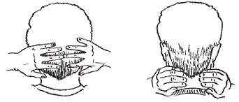 Обе кисти рук накладывают на лицо пациента, соединяя при этом пальцы на переносице, и осуществляют надавливание. Усиливают давление в течение 10 сек. После него некоторое время руки держат на глазах, не надавливая.
