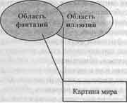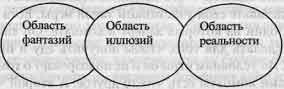 Секрет в расположении внутренней картины мира человека. В большинстве случаев мы легко отличаем собственные фантазии от реальности. Так, мы можем воображать себя богатым, прекрасно зная, что на самом деле это совсем не так. С другой стороны, некоторые представления, которые нам кажутся абсолютно истинными, с точки зрения других людей не более, чем фантазии. Особенно те достоинства, которые мы приписываем себе и которые считаем объективно существующими. Наконец, есть иллюзии, о существовании которых мы и не подозреваем - мир человечества всегда гораздо богаче, чем мир конкретного человека. То есть расположение нашей картины мира в потенциально доступной нам области восприятия можно изобразить следующим образом.