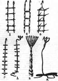 Рутинной обыденностью любого лазутчика были всевозможные подъемы и спуски, и, чтобы не терять на это силы и время, ниндзя, пораскинув умом, разработали множество конструкций портативных лестниц (басиго), изготовляемых из дерева, бамбука или веревок в самых различных их сочетаниях (рис. 63). В одном случае это было сборное изделие, состоящее из двух бамбуковых шестов с металлическими кольцами, куда при сборке вставляли бамбуковые перекладины (рис. 63а). Иногда боковые опоры составлялись из полых кусков бамбука, а вся конструкция скреплялась прочной веревкой, пропущенной внутри бамбуковых трубок (рис. 636). В еще одном варианте вместо шестов использовали веревки с петлями, на которых свободно вращались металлические усы, загоняемые в щели стены и предохраняющие лестницу от раскачивания (рис. 63в). Неплохим приспособление был дубовый шест длиной за два метра с большим зацепляющим крюком и металлическими поперечинами (рис. 63г), хотя чаще применялась сходная, но складная конструкция, состоящая из кусков бамбука, скрепленных внутри крепкой веревкой (рис. 63д). Любопытную модель представляли телескопические грабли синоби-ку-мадэ (рис. 63е), зубцами которых можно было зацепиться за край преграды и по черенку взобраться наверх. В сложенном состоянии такой инструмент имел длину около полуметра, а будучи раздвинутым, позволял преодолеть стены высотой до пяти метров.