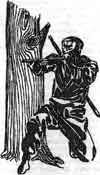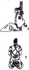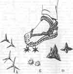 Среди всех этих спецсредств вне конкуренции, однако, была и оставалась крепкая волосяная веревка с одинарным, двойным или тройным зацепляющим крюком, привязанным к одному из ее концов, тогда как по всей длине ее иногда размещались пособляющие опорные узлы или петли (рис. 63ж). Взбираясь по веревке, ее обвивали вокруг правой ноги, пропуская вдоль внутренней стороны бедра, под коленом, по внешней части голени и поперек верха стопы, где она прижималась подошвой левой ноги с тем, чтобы в любой момент там можно было найти схватывающую точку опоры. Руки держали веревку в диагональном "мечевом" захвате и после блокировки стоп обретали определенную свободу, так что могли использоваться в некоторых побочных действиях (веревка при этом придерживалась у тела верхом (локтем) правой руки).