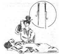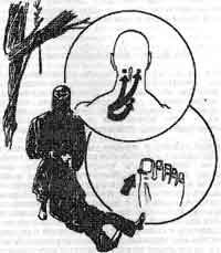 Так, на рану от меча ниндзя накладывал размятые корни нарцисса, пулевое ранение лечил кашицей из лука-порея, а при возможности столбняка (наступив, к примеру, на заржавленную иглу докубари) помещал на область инфекции кожу гольца, время от времени заменяя ее свежим куском. Чтобы спасти повешенного следовало перерезать веревку и подхватив жертву сзади посадить горемыку на землю, слегка наклонив вперед его голову. После этого надо было двумя пальцами (большим и указательным) энергично промассировать две симметричные точки и - фун, расположенные по бокам его затылка, а затем постукать ладонью по седьмому (выступающему) шейному позвонку и, при необходи-мости, прижечь точку ин-паку, находящуюся на большом пальце каждой стопы возле и несколько внутри от его ногтевого ложа (рис. 65).