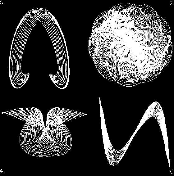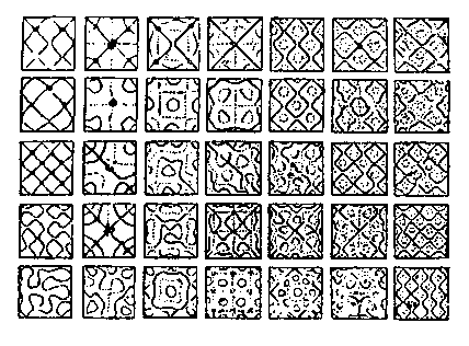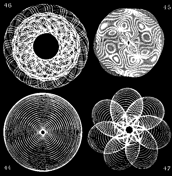 Звуковая пластинка (рис. 1) изготовлена из латуни или зеркального стекла. Мелкие песчинки рассыпают по её поверхности, а по её краю проводят смычком. Песок подбрасывается в воздух вибрацией пластинки и падая на неё снова, складывается правильными линиями (рис. 2). Касаясь смычком пластинки в разных местах, можно получать разные ноты, и следовательно, разные рисунки (рис. 3). Если фигуры, приведённые здесь сравнить с теми, которые производит человеческий голос, то можно найти много сходства. Эти изображения возникают по причине взаимодействия создающих их колебаний. Можно сообщить маятнику два или более одновременных движений, и присоединив к нему тонкое перо посредством рычага, точно зафиксировать его путь. Теперь подставьте на место маятника колебания в астральном или ментальном теле и нам станет ясен принцип получения форм при помощи вибраций.