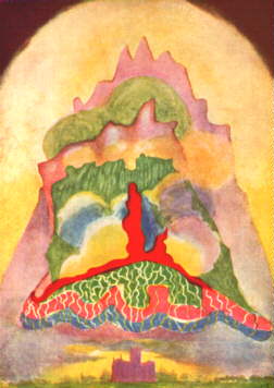 Вагнер. — Никто из занимавшихся каким-либо изучением этих музыкальных форм, не стал бы колебаться, приписав этот ряд гор, изображённый на иллюстрации W, гению Рихарда Вагнера, поскольку никакой другой композитор ещё не строил звуковых сооружений с такой мощью и решительностью. В этом случае мы имеем гигантское колоколообразное сооружение, целых девятьсот футов высотой, и немного менее диаметром в основании, плывущее в воздухе над церковью, из которой оно восстало. Оно полое, подобно форме Гуно, но, в отличие от неё, открыто внизу. Сходство с последовательно отступающими горными цепями почти совершенное и оно усиливается ещё больше волнистыми массами облаков, которые клубятся между скал и создают эффект перспективы. На этом рисунке не было сделано никакой попытки показать действие отдельных нот или отдельных акордов; каждая гряда этих искусственных гор представляет в размере, виде и цвете только общий эффект одной из секций музыкальной пьесы, как видится с расстояния. Но следует понимать, что на самом деле обе — эта и форма, приведённая на иллюстрации G, — полны мельчайших деталей, как показано на иллюстрации M, и что все эти великолепные массы цвета построены из многих сравнительно меньших полос, которые невидимы раздельно в масштабе, в котором это нарисовано. Общий результат таков, что каждая вершина горы имеет свой сияющий оттенок, точно как это видно на иллюстрации — великолепное пятно живого цвета, сверкающее славой своего собственного живого света, распростряняя своё блестящее излучение по всей округе. Уже в каждой из этих масс света остальные цвета постоянно мерцают, как на поверхности расплавленного металла, так что блики и блеск этих удивительных астральных сооружений находятся далеко за пределами способности описания любых физических слов.