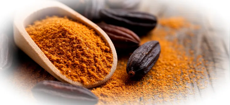 - Естественная сладость. Кэроб примерно на 50% состоит из натуральных сахаров (сахароза, фруктоза, глюкоза), что позволяет использовать его в выпечке и десертах без добавления рафинированного сахара.