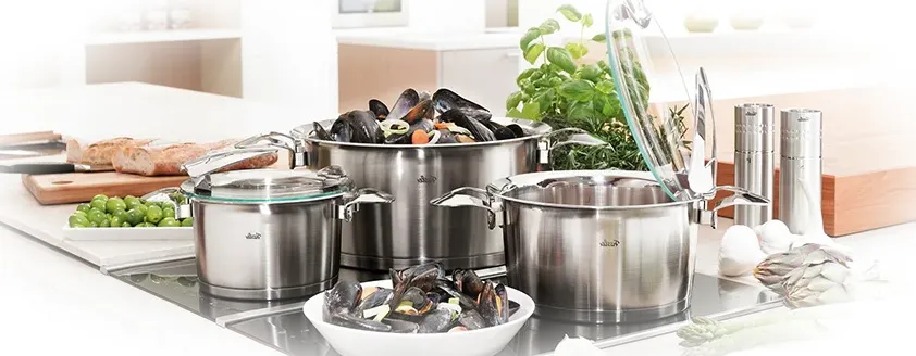 Посуда из нержавеющей стали наряду с алюминием и чугуном является фаворитом на кухнях всего мира. Посуда из нержавеющей стали не образует вредных соединений и токсичных веществ, сохраняет вкусовые качества, не впитывает бактерии за счёт отсутствия пор и возможности возникновения трещин. Недостаток низкой теплопроводимости нержавеющей стали решён за счёт применения капсулированного дна: пища не пригорает и долго сохраняет тепло.